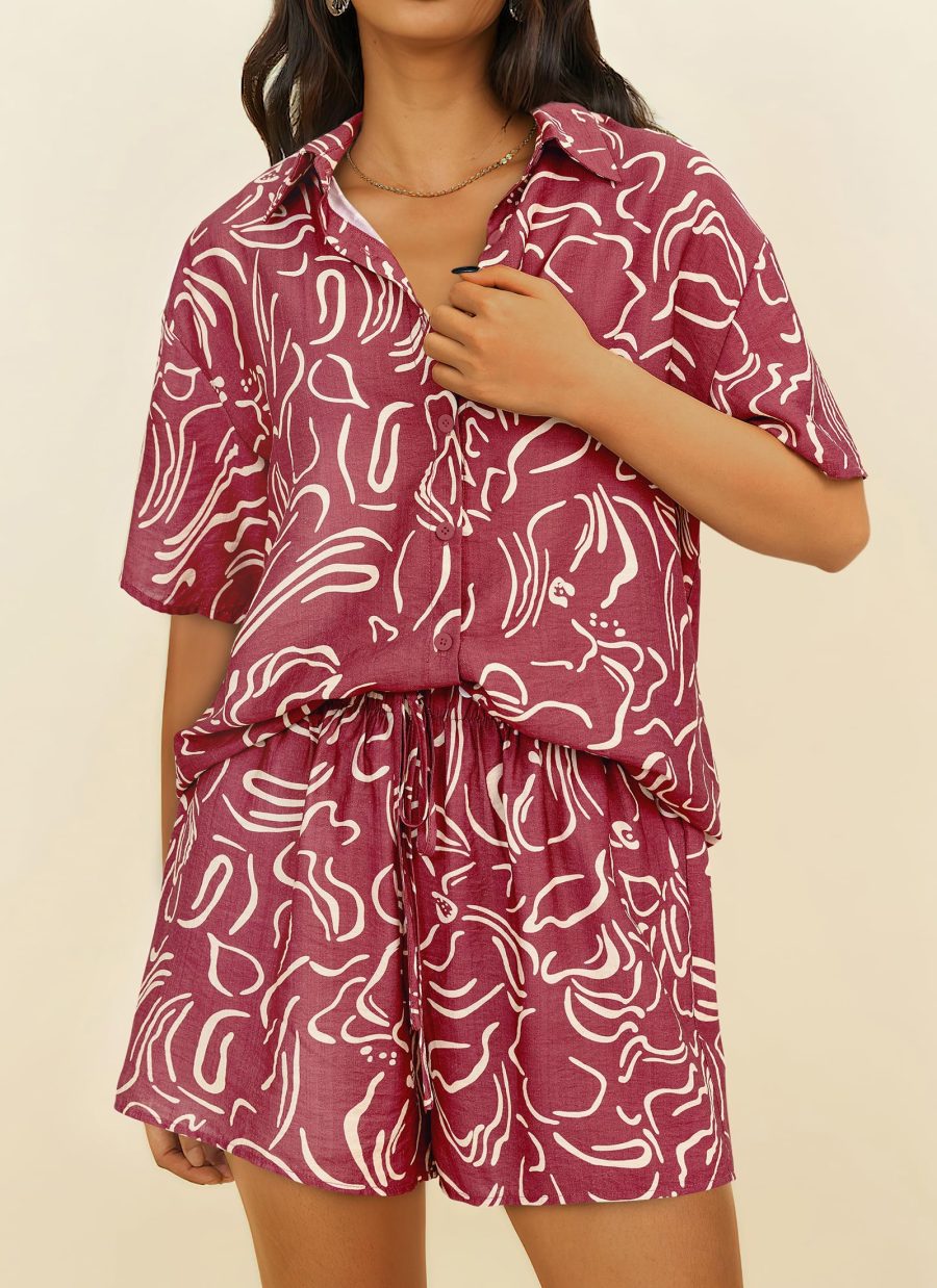 Design: Two-piece suit, button-down casual shirt, high-waisted shorts suit