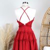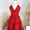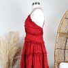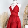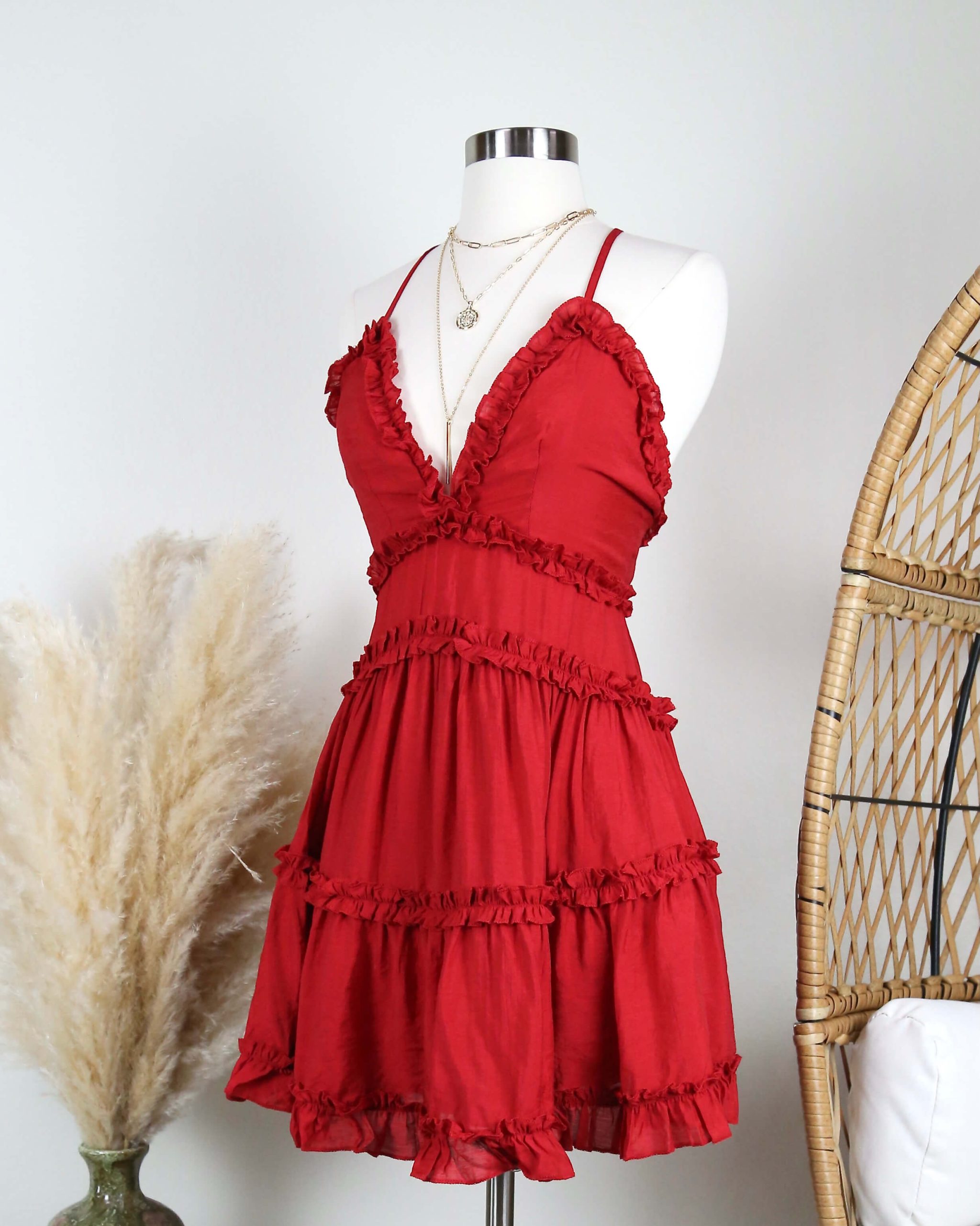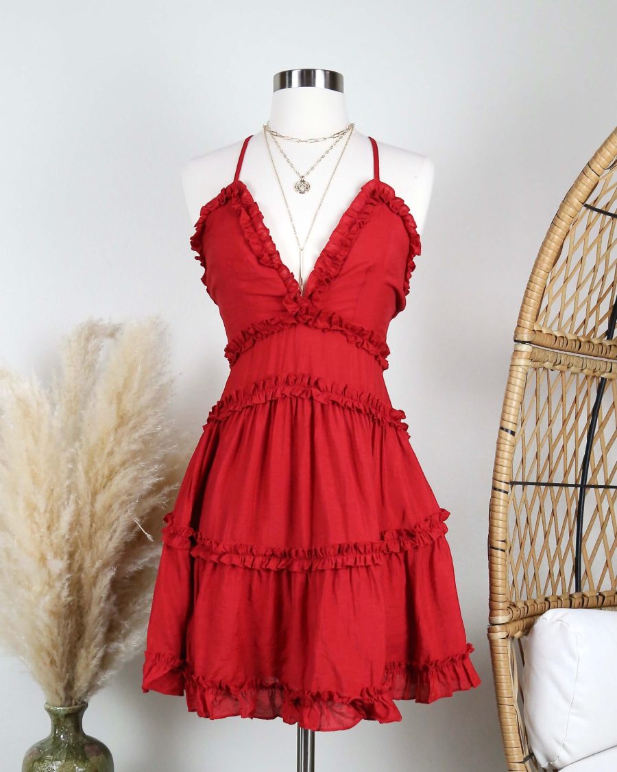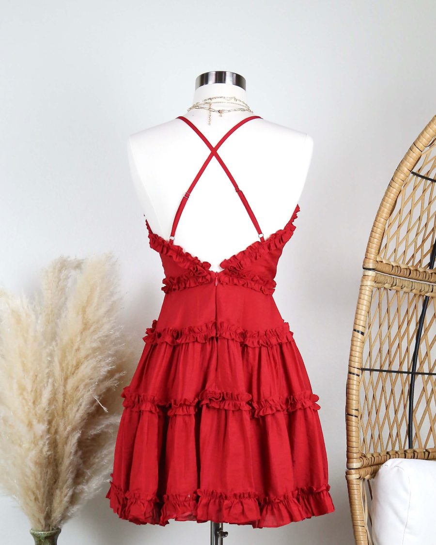 A stylish dress that is easy to put on, making you the cutest one almost instantly. A perfect lightweight piece to bring on your next vacation/staycation, featuring ruffled layers, criss cross back, and a deep v-neck.