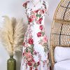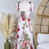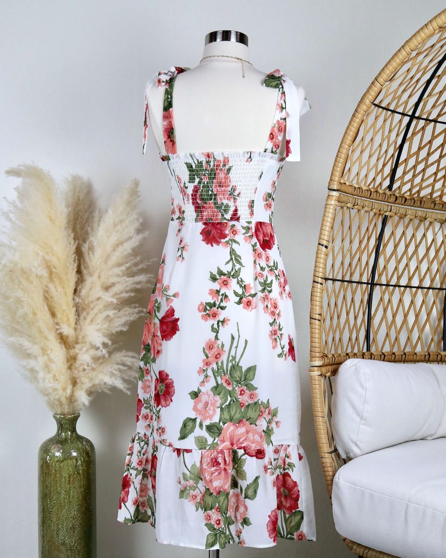This beautifully constructed long dress features a tie strap design, smock back with hidden zipper, romantic floral prints and a chiffon like fabric design.