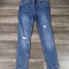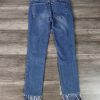 Super stretchy mid rise skinnies featuring busted out knees and raw edges. Five-pocket style with a button closure and zip fly.