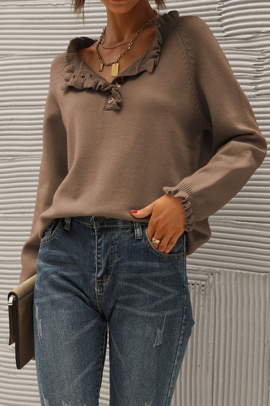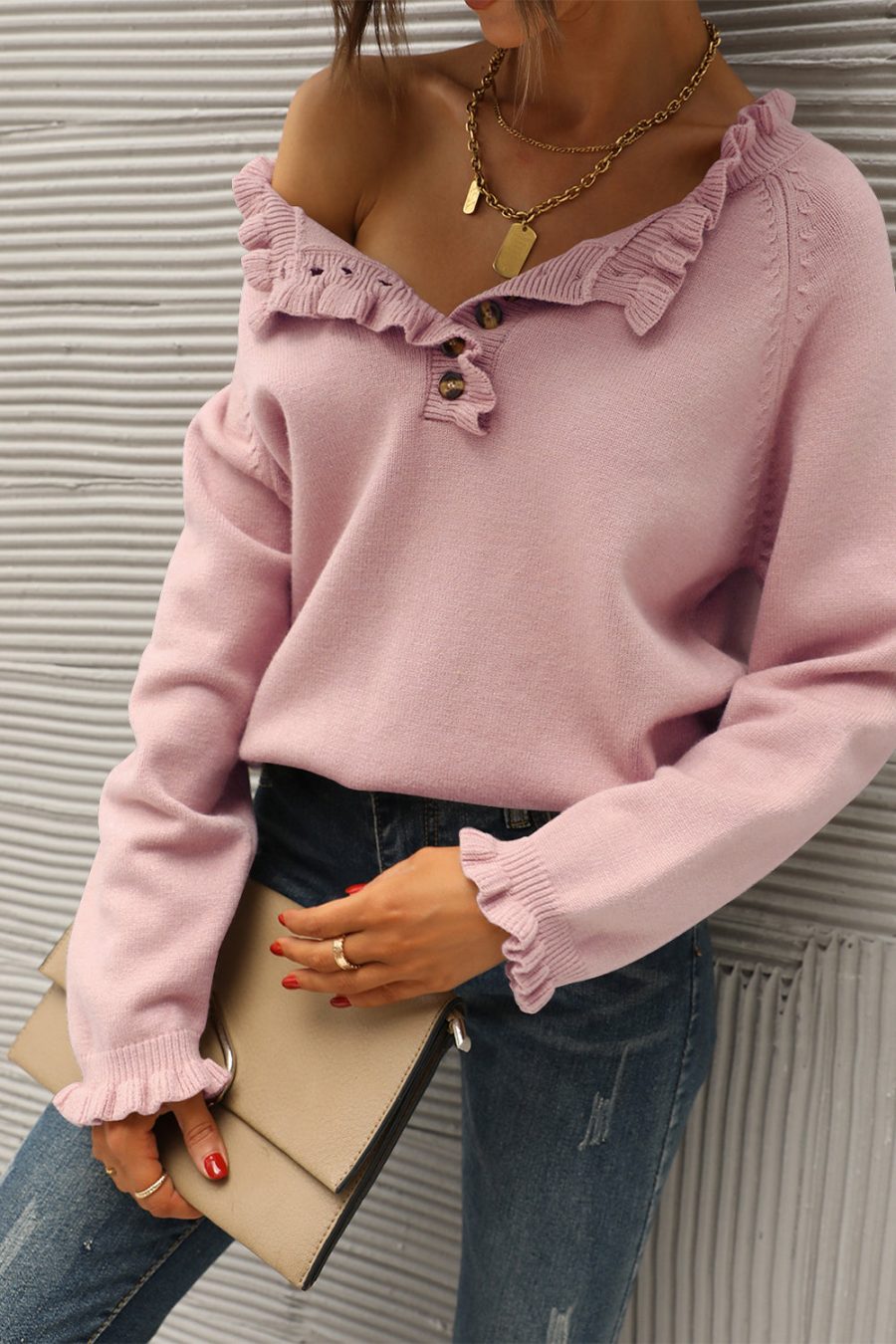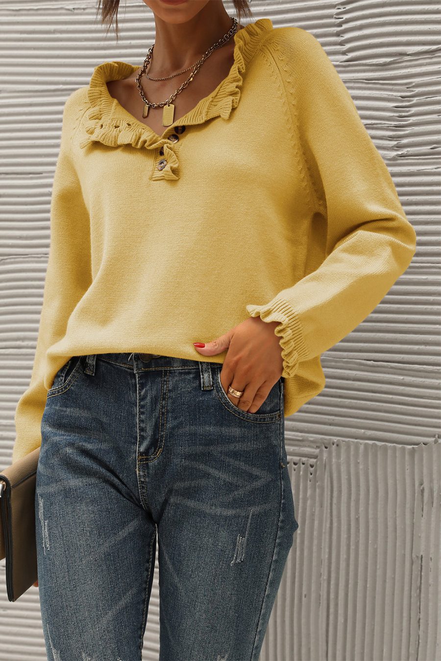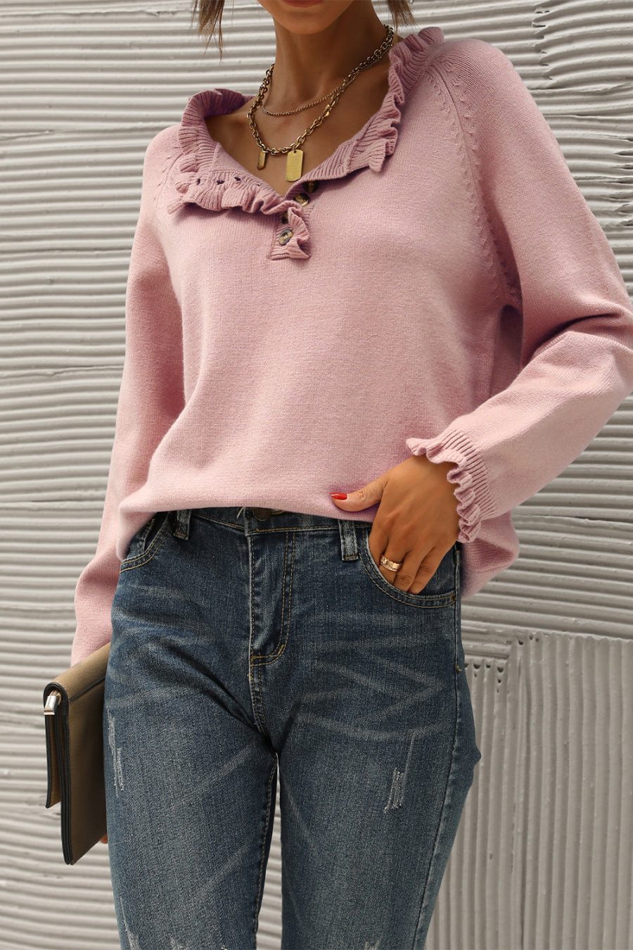 Long Sleeve Button Down Ruffle Knit Pullover Sweater Tops