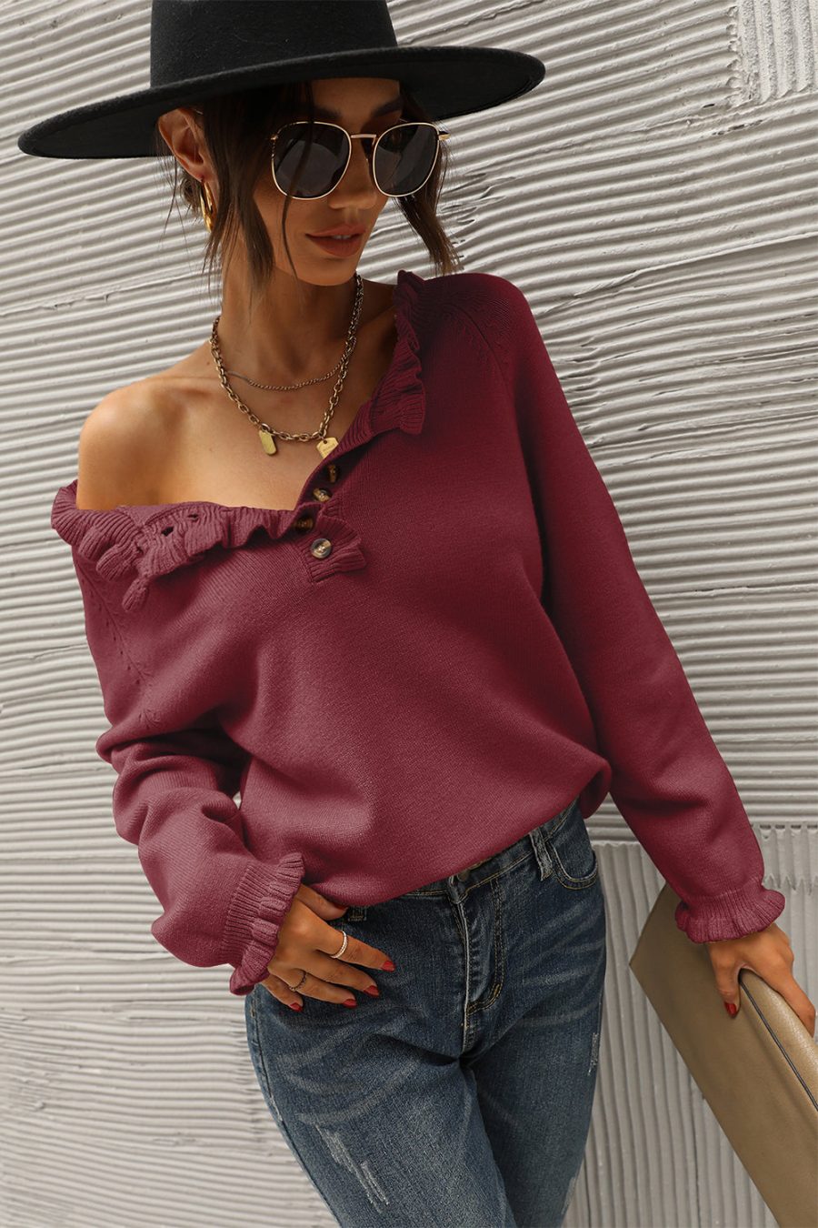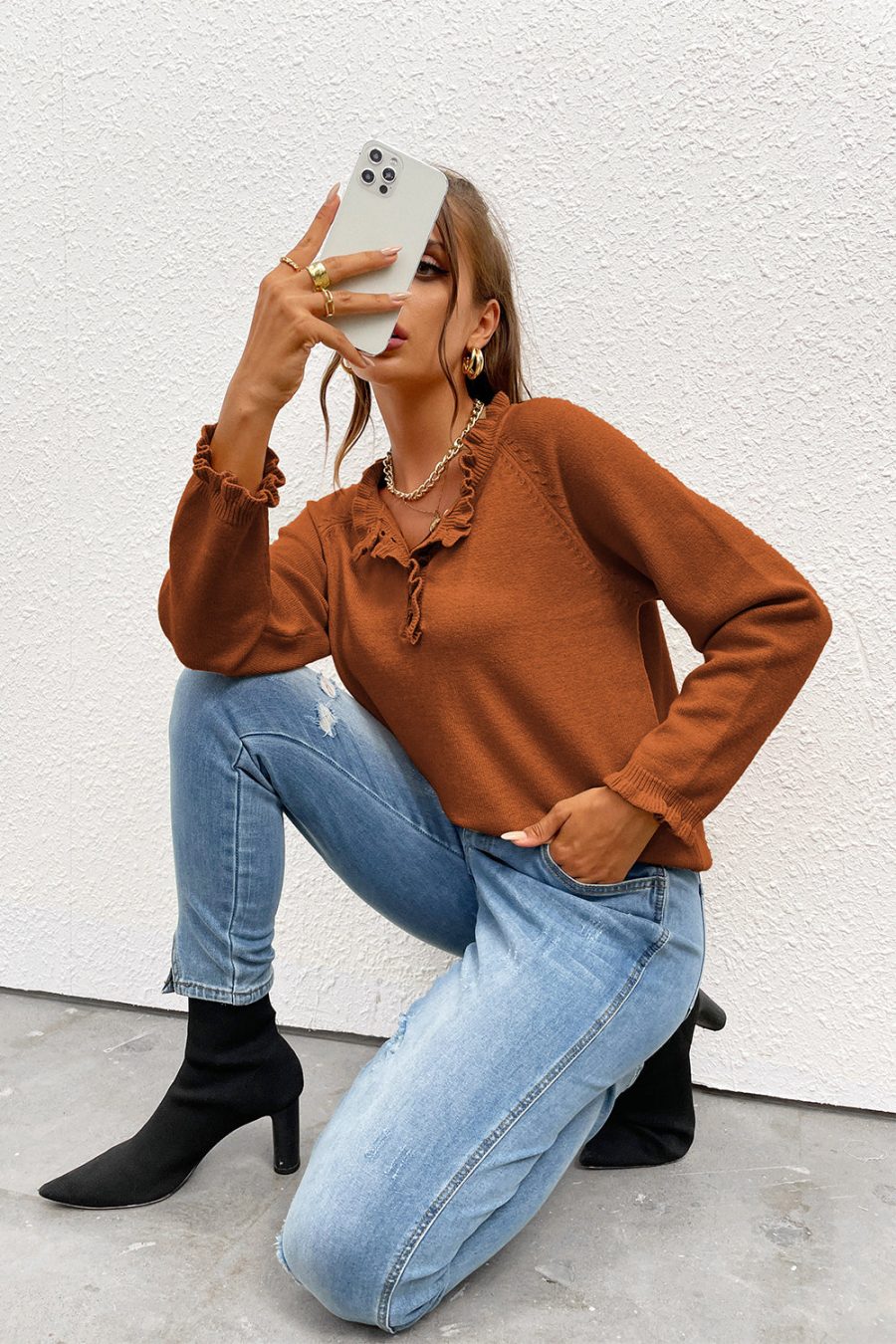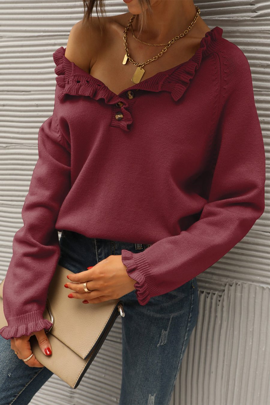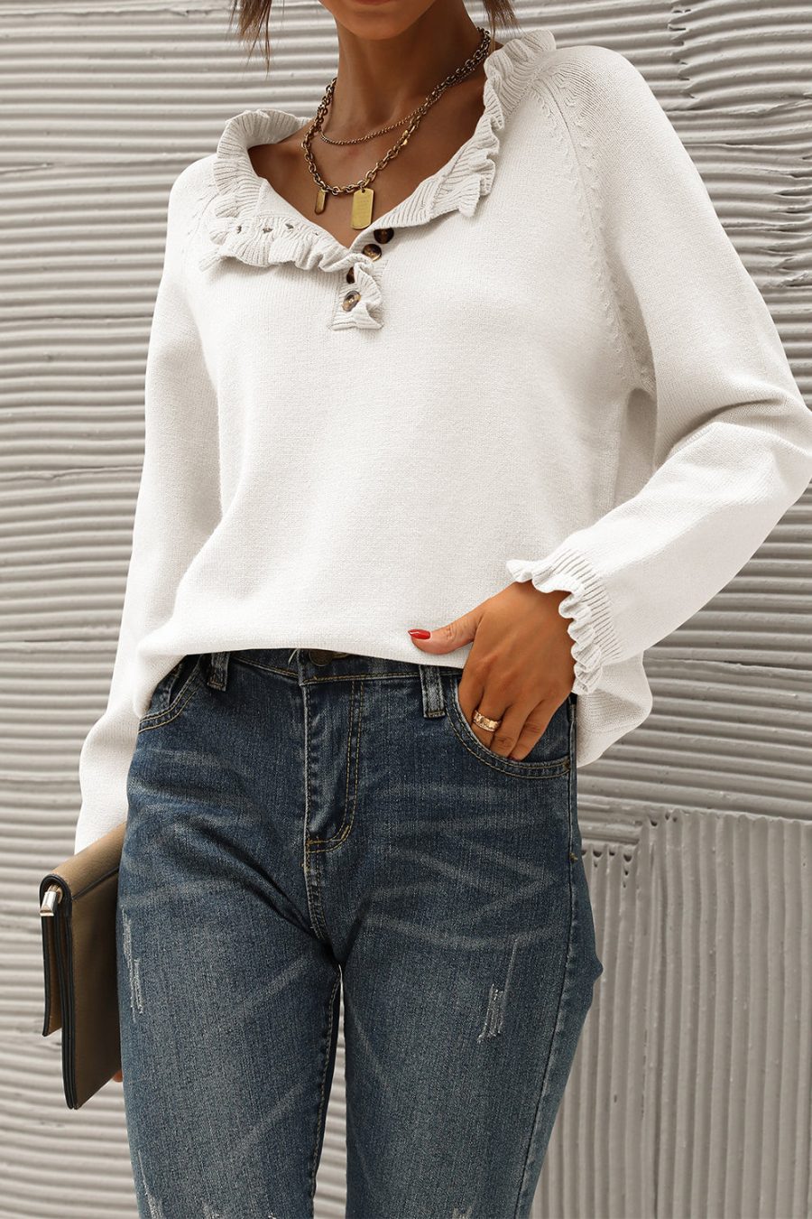 Long Sleeve Button Down Ruffle Knit Pullover Sweater Tops