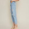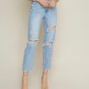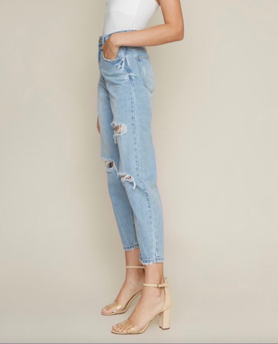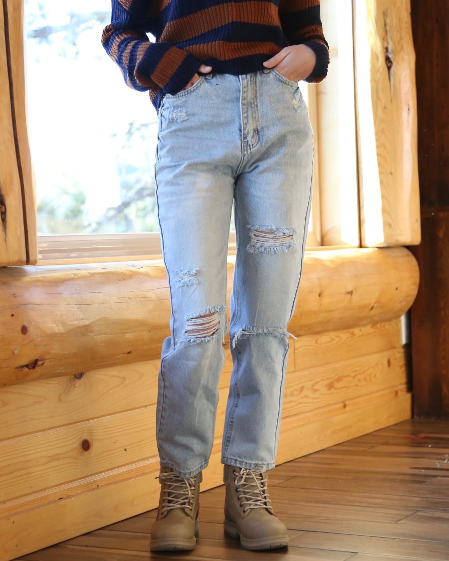 Everyone loves a good pair of mom jeans! These feature multiple areas of distressing, straight leg, and are high waisted. Pair these jeans with a bodysuit and some heels for a classy look!
