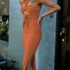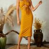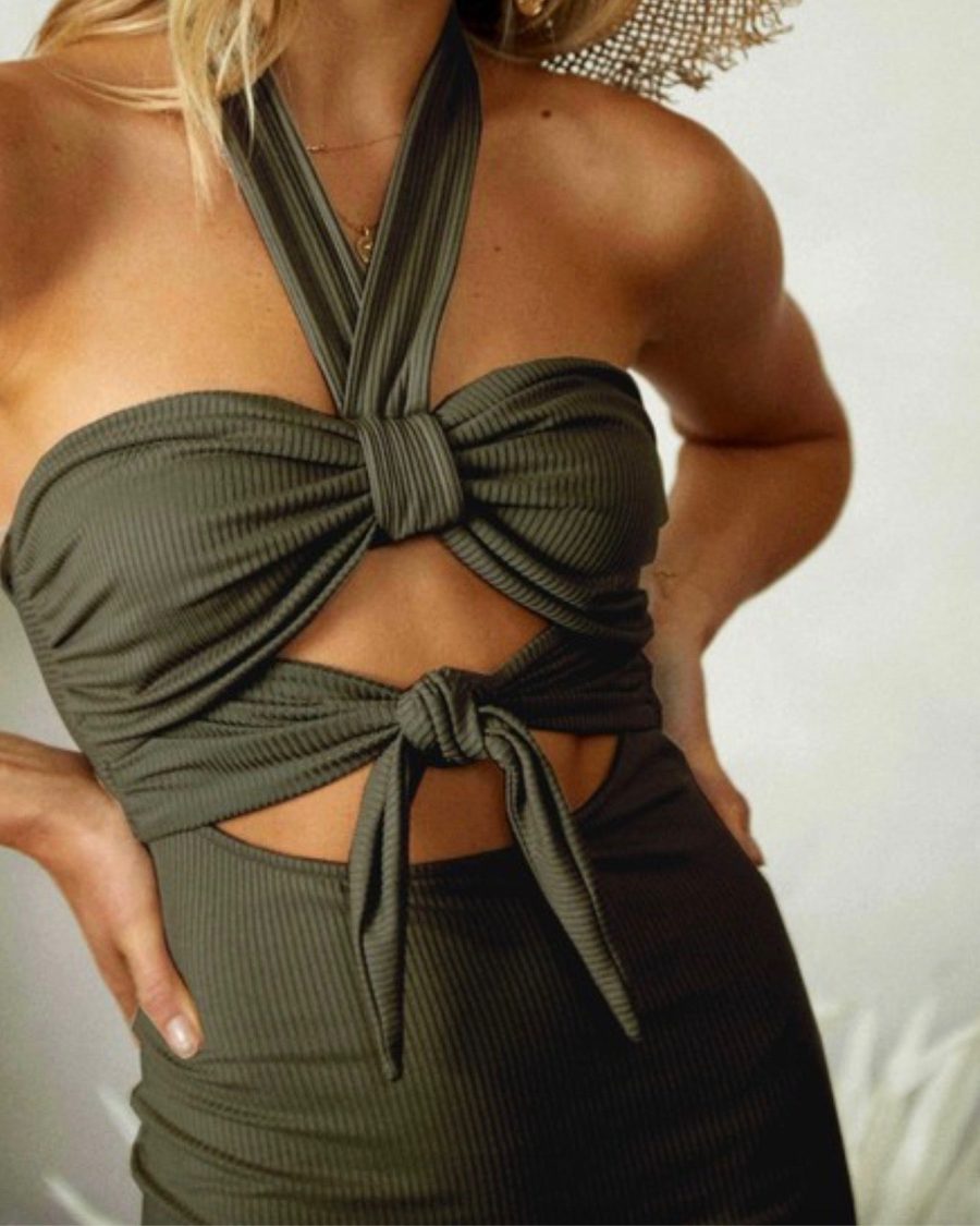 This dress is the perfect dress for any occasion! Featuring a tie front detail, halter neckline, and ribbed fabric, this dress will for sure be your next favorite this spring and summer seasons! Pair this dress with some sandals and a hat for a more casual look.