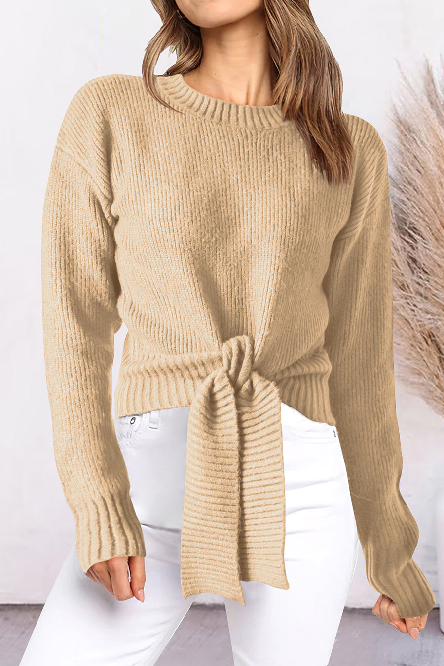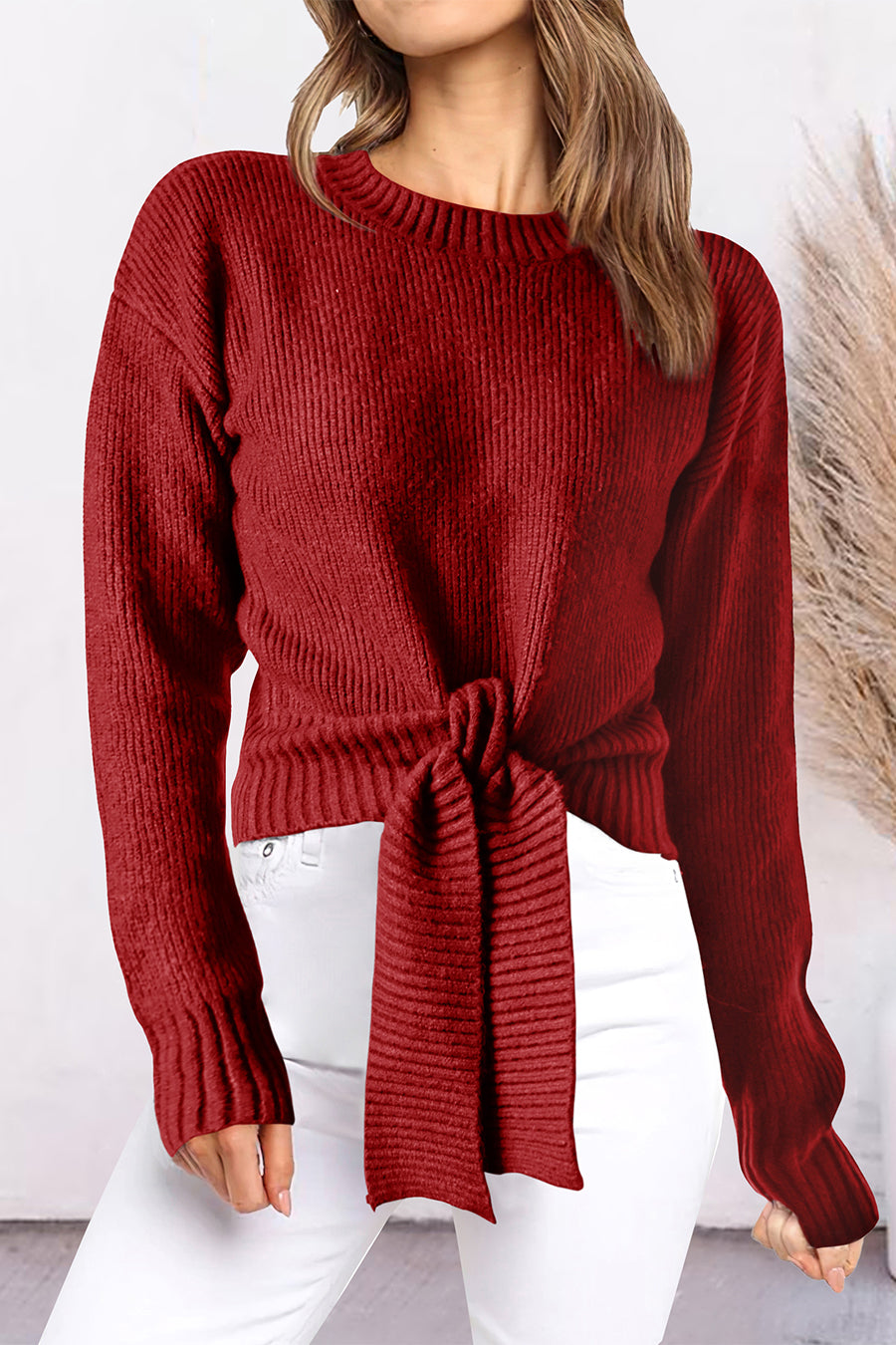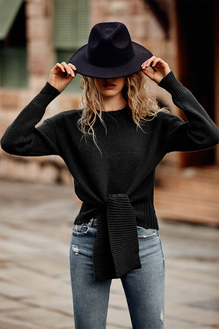 Tie Front Crew Neck Ribbed Pullover Tops Jumper quantity